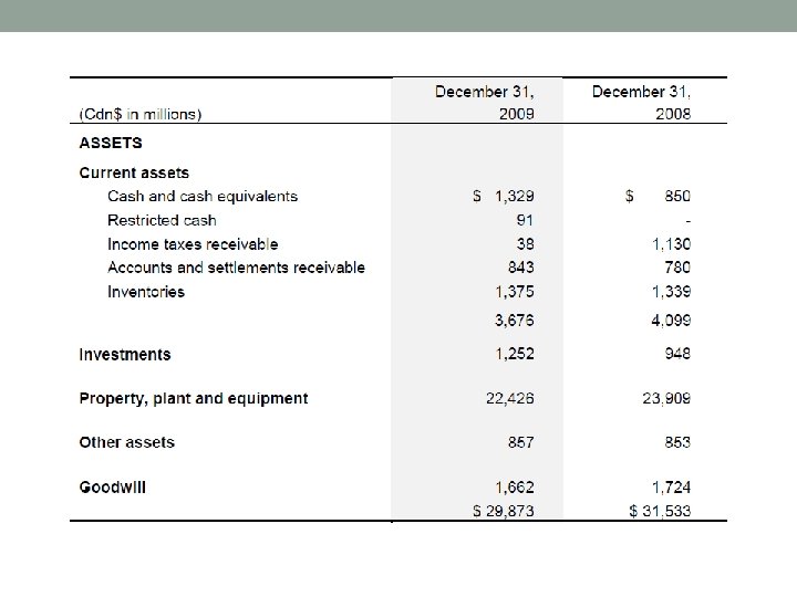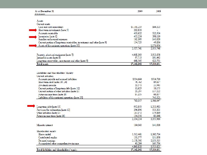 Debt positions and credit ratios (in millions) Dec. 31, 2008 Dec. 31, 2009 March 5, 2010 Term loan 3, 937 2, 325 800 Bridge loan 5, 284 - - Fixed rate term notes 1, 181 5, 086 167 205 Total debt (US$) 10, 569 7, 616 6, 091 Total debt (C$) 12, 874 8, 004 6, 402 850 1, 420 900 12, 024 6, 584 5, 502 D/E 54% 36% 29% Net D/E 52% 31% 26% Other Cash balances (C$) Net debt (C$)