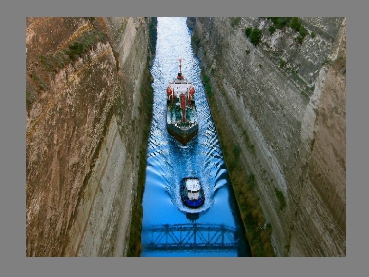 Canal de Corinthe (Gréce) Longueur : 6, 3 km Largeur : 21 m Profondeur : 87 m Inauguré en : 1893 En l’an 67 aprés JC. César Néron utilise 6000 prisonniers de guerre pour percer le canal, mais aprés une longue interuption il est continué en 1870.