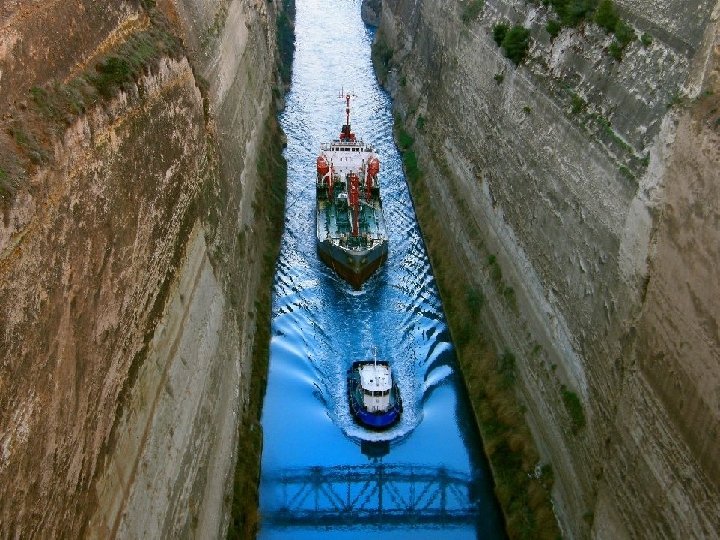 Canal de Corinthe (Gréce) Longueur : 6, 3 km Largeur : 21 m Profondeur : 87 m Inauguré en : 1893 En l’an 67 aprés JC. César Néron utilise 6000 prisonniers de guerre pour percer le canal, mais aprés une longue interuption il est continué en 1870.