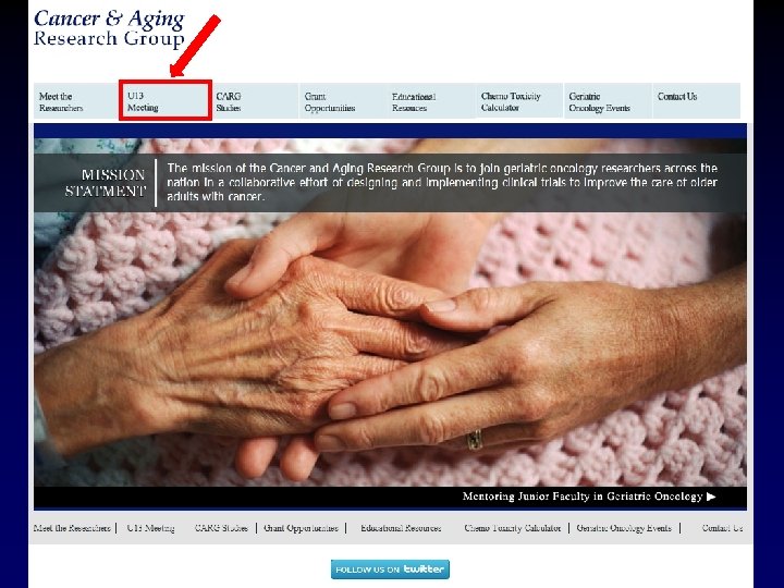 U 13 Oversight Board Arti Hurria, MD (PI) Supriya Mohile, MD, MS (co-PI) William Dale, MD, Ph. D (co-PI) CARG NIA Basil Eldadah, MD, Ph. D* Alliance Margaret Mooney, MD* NCI Julie Rowland, Ph. D AACR Harvey Cohen, MD (Geriatric Oncology) Martine Extermann, MD (Geriatric Oncology) SIOG Betty Ferrell, Ph. D (Nursing Research) ONS Hyman Muss, MD (Geriatric Oncology) ASCO Richard Schilsky, MD (Oncology) AGS Kenneth Schmader, MD (Geriatrics) *Prior Oversight Board Members: Susan Nayfield and Edward Trimble