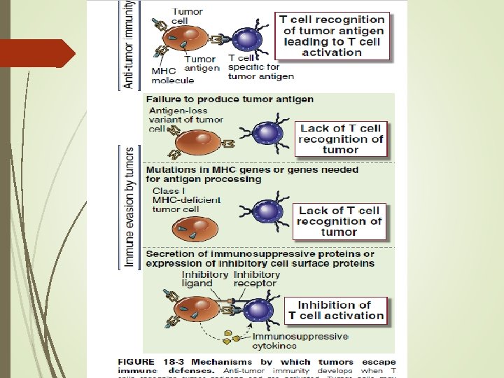 Tumor evasion of the immune system: Escaping Immune Recognition by Loss of Antigen Expression: Immune responses to tumor cells impart selective pressures that result in the survival and outgrowth of variant tumor cells with reduced immunogenicity, a process that has been called tumor immunoediting. -loss of tumor-specific antigens- class I MHC expression may be downregulated on tumor cells so that they cannot be recognized by CTLs.