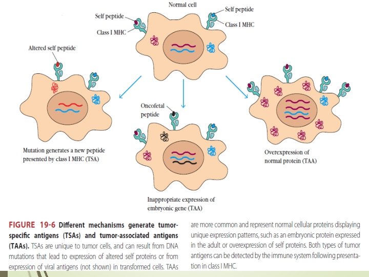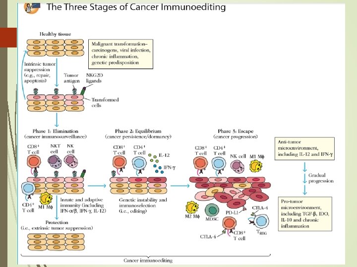 IMMUNE RESPONSES TO TUMORS Innate and adaptive pathways participate in cancer detection and eradication: Innate 1. NK cells recognition mechanisms use a series of surface receptors that respond to a combination of activating and inhibiting signals delivered by self cells: cells that have reduced class I MHC expression giving NK cells stimulatory signals (some tumors lose expression of class I MHC molecules, makes the tumors good targets for NK cells. ) express ligands for NK cell–activating receptors. (DAMPs, NKG 2 D, DNA damage) NK cells can be targeted to Ig. G antibody–coated tumor cells by Fc receptors. The tumoricidal capacity of NK cells is increased by cytokines, including interferon -γ (IFN-γ), IL-15, and IL-12, and the anti-tumor effects of these cytokines are partly attributable to stimulation of NK cell activity. IL-2–activated NK cells, called lymphokine-activated killer (LAK) cells, are derived by culture of peripheral blood cells or tumor-infiltrating lymphocytes from tumor patients with high doses of IL-2.