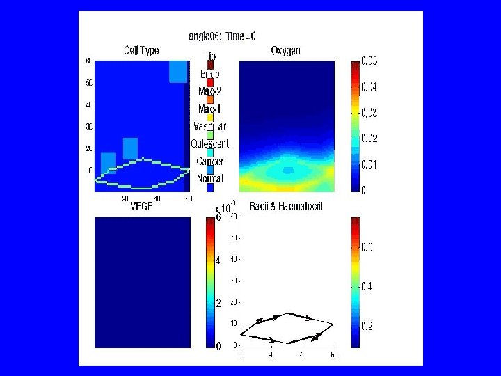 • Model includes the production of VEGF by cells in response to low levels of oxygen (hypoxia). VEGF is an angiogenesis factor – it produces more blood vessels.
