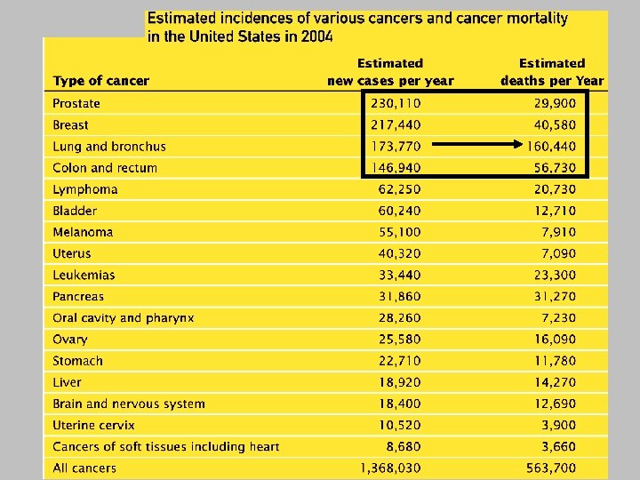 2003 Estimated US Cancer Deaths* Lung & bronchus 31% Men 285, 900 Women 270, 600 25% Lung & bronchus Prostate 10% 15% Breast Colon & rectum 10% 11% Colon & rectum Pancreas 5% 6%Pancreas Non-Hodgkin lymphoma 4% 5%Ovary Leukemia 4% 4%Non-Hodgkin lymphoma Esophagus 4% 4%Leukemia Liver/intrahepatic bile duct 3% 3%Uterine corpus Urinary bladder 3% Kidney 3% All other sites 22% 2%Brain/ONS 2%Multiple myeloma 23% All other sites ONS=Other nervous system. *Excludes basal and squamous cell skin cancers and in situ carcinomas except urinary bladder. Source: American Cancer Society, 2003.
