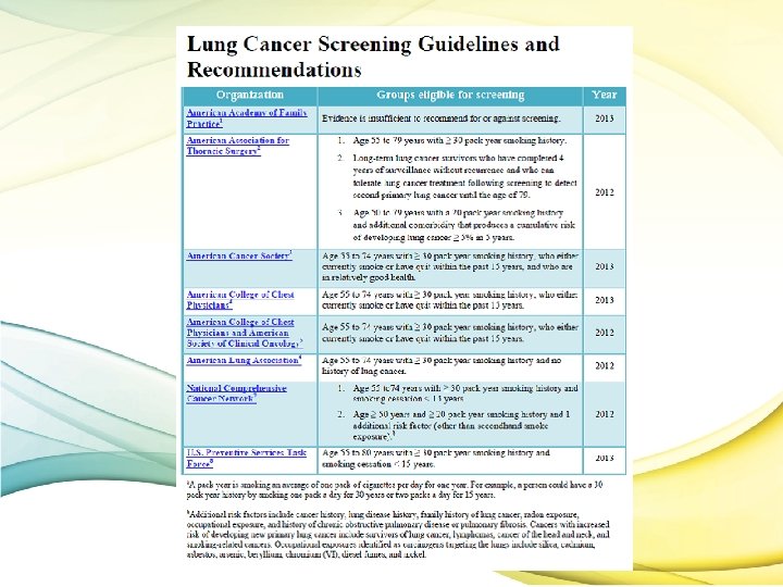 Recent Changes in Recommendations due to National Lung Screening Trial • 2002 -2010 • 53, 454 participants • Participants: 55 -74 yo, 30 pack year smoking history current or former smokers • Low Dose Chest CT versus Chest X-ray for 3 years • Followed for and average for an average of 6. 5 years