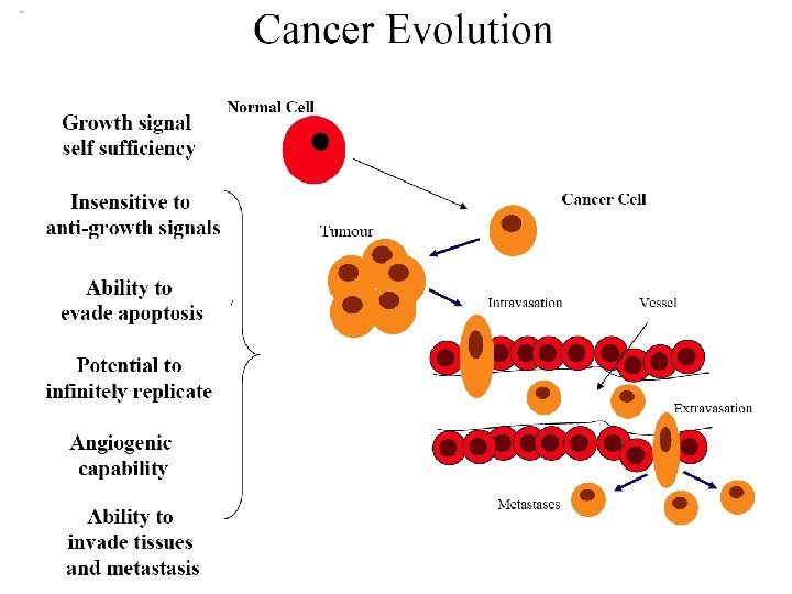 Somatic evolution of cancer cell populations (1) Stepwise, nested generation of hierarchical among-cell genetic, epigenetic, cytogenetic diversity leading to evolution of six hallmarks of cancer via mutation, epimutation, chromosomal alterations; evolution in response to selective pressures including immune system, ‘competition’ between cells, ‘cooperation’ between cancer cell lineages Origin of genomic instability, leading to much higher mutation rate (2) Evolution of cancer cell populations in response to therapeutic agents
