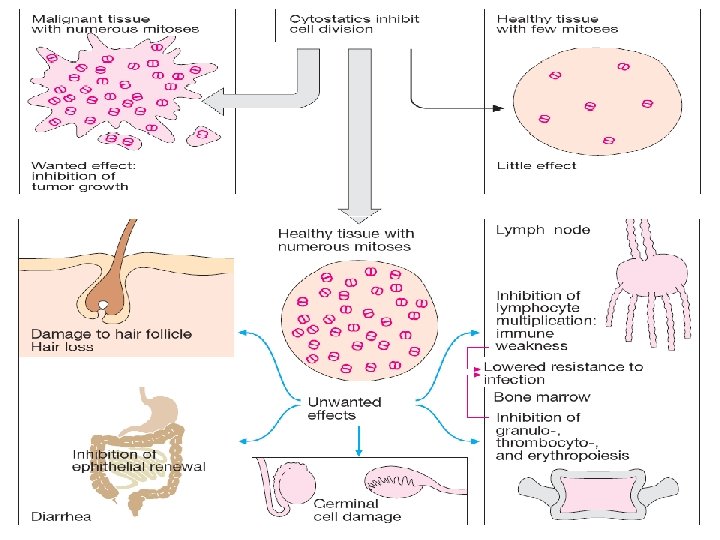 Cancer Chemotherapy • Cancer drugs are not specific for cancer cells but are cytotoxic to all proliferating cells in cycle. • Their major unwanted toxicity is damage to bone marrow function and to the epithelial lining of the gut. • Generally speaking, these are the dose-limiting toxicities. • Nausea and vomiting may also be serious side-effects which are now well-controlled by 5 -HT 3 antagonists (Ondansetron).