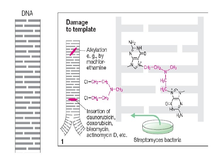 Actinomycin • Actinomycin is a very potent inhibitor of RNA polymerase. Does intercalate in the minor groove of the double helix. • In the cancer clinic it finds use against special tumours, particularly Wilm’s tumour which is a cancer of the kidney in children (in combination with vincristine). • It is also combine with methotrexate in the treatment of gestational choriocarcinoma. • Its toxicities are bone marrow and gut suppression.