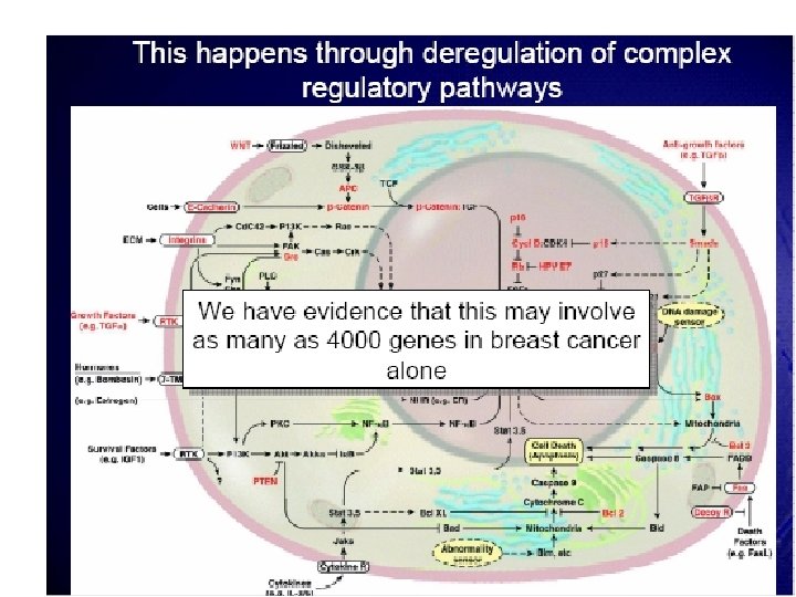 (5) Deregulation of apoptosis THIS IS THE BIG DADDY OF THEM ALL! The genomic instability of tumour cells inevitably leads to deregulation of the apoptotic pathways. This results in a generalised reduction in the sensitivity to all forms of cellular insult. THE REAL BRICK WALL.