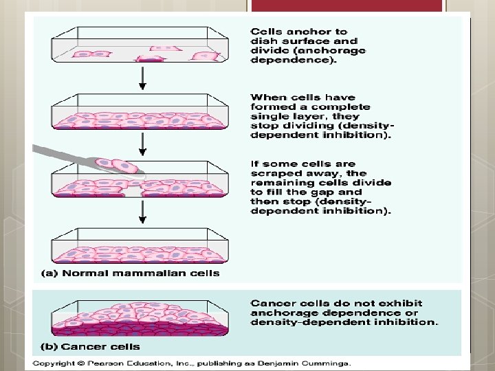 Other External Signals that Control Cell Division A clear example of external signals is densitydependent inhibition, in which crowded cells stop dividing Most animal cells also exhibit anchorage dependence, in which they must be attached to a substratum in order to divide Cancer cells exhibit neither density-dependent inhibition nor anchorage dependence