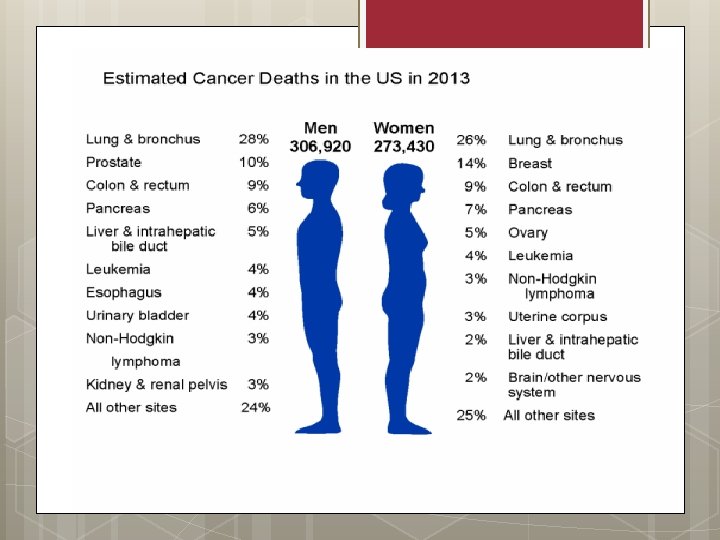 • It is possible to inherit a gene that predisposes someone to cancer • Example = BRCA 1 & BRCA 2 genes (breast cancer) - BRAC Analysis • Other known carcinogens are highly linked to certain cancers, for instance: • Tobacco = lung • UV radiation = skin • Human Papilloma Virus (HPV) = cervix