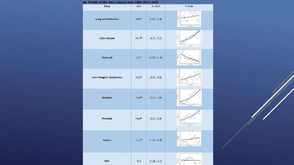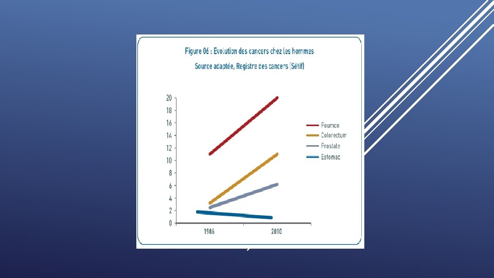 Incidence of the Main Sites in Algeria, in men, 2014 Sites Crude Rate /100, 000 ASR (WR)/100, 000 Lung and Bronchus 16. 9 25. 8 61 Colo-rectum 10. 3 14. 3 65 Bladder 9. 4 13. 9 67 Prostate 8. 2 11. 8 71 Stomach 4, 7 6, 1 61 NPC 4. 5 5. 9 43 Non-Hodgkin Lymphoma 4, 3 5, 4 57 Larynx 3, 0 4, 3 63 Leukaemia 2, 8 3, 8 41 Median age