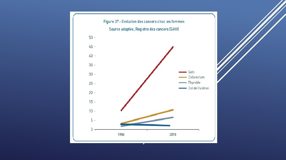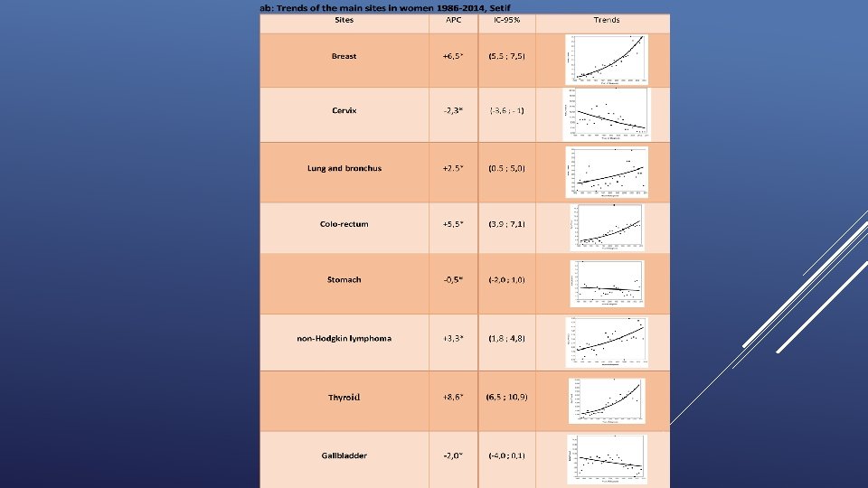 Comparison OF ASR(WR)/100, 000 of main sites in Women in North Africa Algeria Tunisia (North) (Casablanca) Libya (Benghazi) Morocco Sites (National Network) Breast 65. 2 30, 9 36, 4 22, 9 Colo-rectum 16. 5 9, 2 5, 8 12, 3 Cervix 10. 2 4, 6 15 4, 5 Thyroid 8. 1 3, 3 6, 7 3, 8 Non-Hodgkin Lymphoma 4. 9 3, 8 4, 7 4, 3 Estomac 4, 7 3, 2 2, 7 3, 0 Gallbladder 4. 5 2, 6 1, 9 3, 2 Leukaemia 4, 2 2, 8 2, 0 4, 8