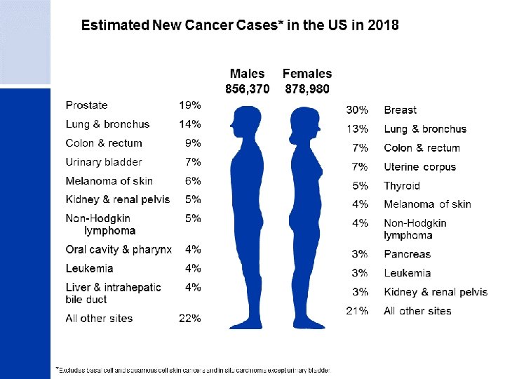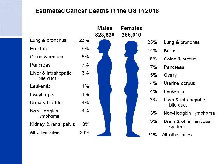CANCER STATISTICS �It is estimated that 1. 7 million people will be diagnosed with cancer in 2018. �An estimated 601, 000 people will die from cancer in 2018. �Average lifetime risk for developing cancer: �Males: 39. 7% Females: 37. 6%