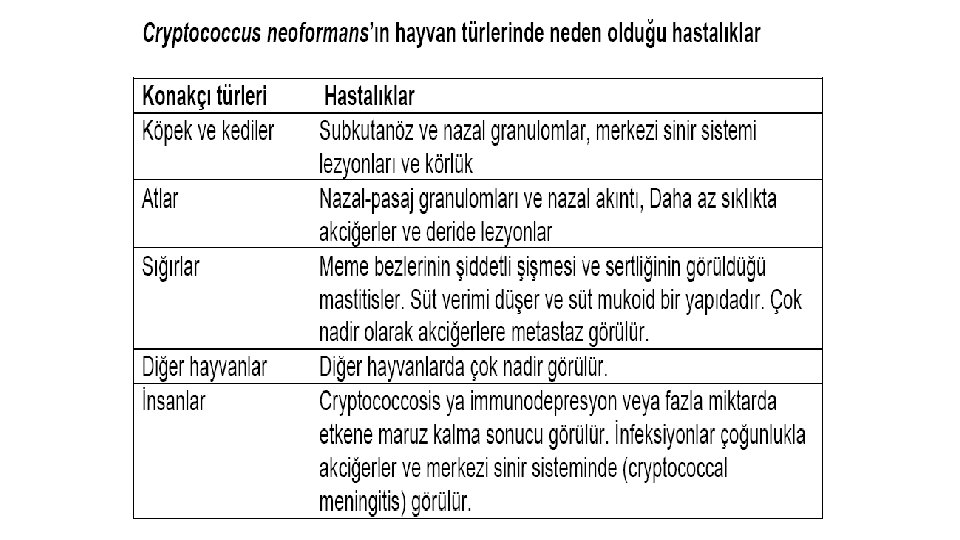 • Cryptococcosis, is a subacute and chronic disease characterized by Cryptococcus neoformans in humans and animals. Within 19 Cryptococcus species only Cryptococcus neoformans are pathogenic for humans and animals. • Thin-walled budding yeast that varies from spherical to oval and varies in diameter from 2. 5 to 20 μm. • • Cells are surrounded by a polysaccharide capsule in a mucoid structure with varying thickness, and this capsule is larger in animal tissues. The young cells are single and bud with a thin neck from the main cell. • Cryptococcus neoformans is a member of the Fungi Imperfecti class. • Cryptococcosis (European blastomycosis, torulosis) is a subacute or chronic infection involving the central nervous system, respiratory system and eye.