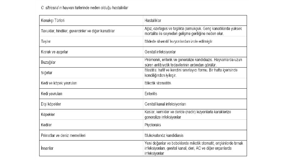 Clinical Symptoms • In poultry, clinical signs are hardly observable. • The cases are usually sporadic and rarely endemic. Upper respiratory tract and digestive system are affected the most. • In acute cases, yellow-white lesions are loose in the mucosa of the necropsy coats; In chronic cases, it is observed on the surface of the mucosa and a structure covered with necrotic membrane like towel. • Mycoses from C. albicans are rarely encountered in ruminants and pigs In cases, abortus, mastitis, mycotic stomatitis, pneumonia and rumenitis are usually observed. • In dogs and cats skin, otitis, intestinal candidiasis, genital candidiasis