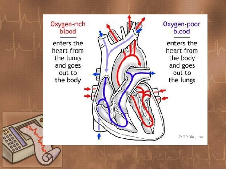 Types of ECG • ECG may be performed with “leads”- which are thin cables that attach to the patient’s limbs. • Some ECG machines may attach directly to the chest wall. These types of machines may be used for a monitoring period in which the heart is being evaluated over a set amount of time (24 hour period). • The number of leads depends on the type of machine that is being used. • Each lead is marked to a specific are and should be attached correctly, otherwise the results will be incorrect.