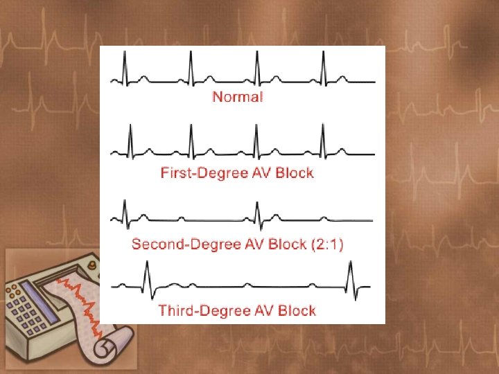Sinus Arrest or Block • Normal sinus rhythm interrupted by an occasional prolonged failure of the SA node to initiate an impulse. • Conduction disturbance in which normal sinus rhythm is interrupted by an occasional, prolonged failure of the impulse generated by the SA node to reach the atria.