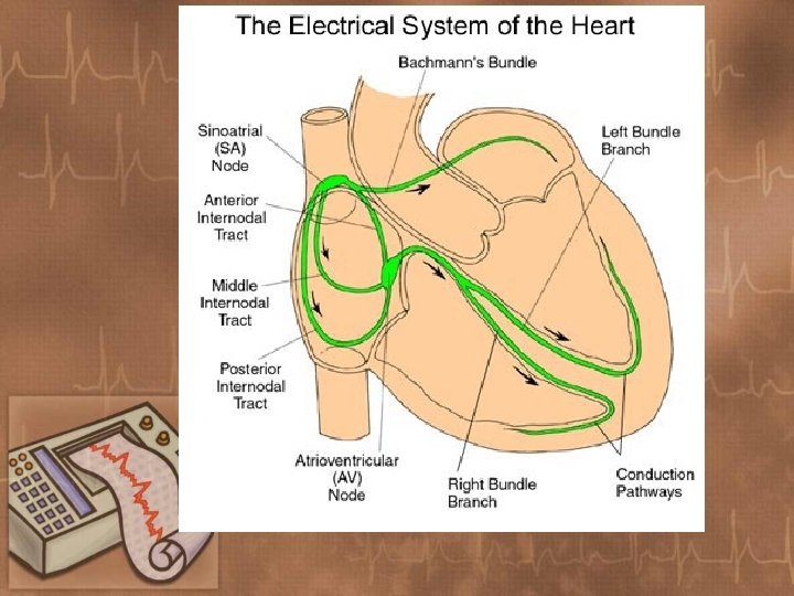 Conduction System of the Heart • Electrical impulses are transmitted through the heart via specialized conduction cells in a specific sequence: • Sinoatrial (SA) node • Interatrial and internodal conduction tracts • Atrioventricular (AV) node • Bundle of His • Left and right bundle branches • Purkinje fibers
