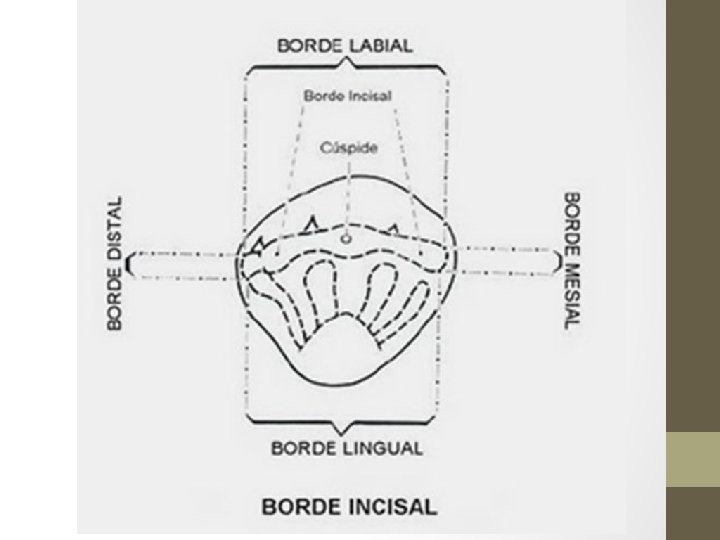 Corona • La corona es difiere en forma de los otros dientes anteriores debido a su borde incisal. • llamados brazos del borde incisal.
