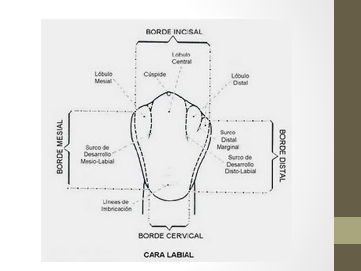 Cara labial • De figura pentagonal irregular ligeramente alargada, orientada al eje longitudinal del diente. • Fuertemente convexa de mesial a distal, en ocasiones tan ostensible que puede considerarse a la superficie dividida en dos vertientes.