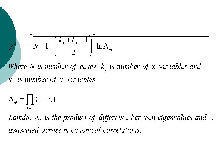 Equations ¡ Testing Canonical Correlations l Since there will be as many Can. Corrs as there are variables in the smaller set not all will be meaningful.