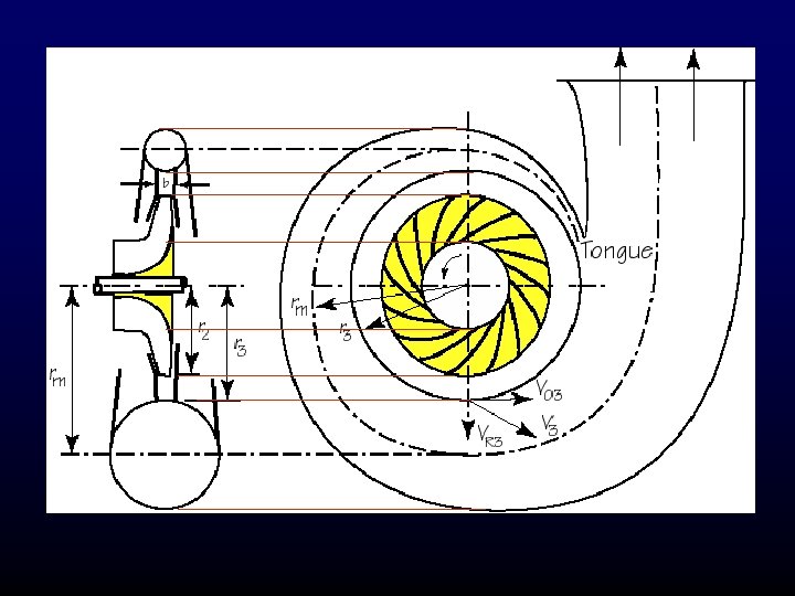 Bomba com Difusor: o fluido escoa através de uma série de palhetas fixas que formam um anel difusor. Isso permite uma mudança uma conversão mais eficiente da energia cinética em energia de pressão que a bomba de voluta simples. Figura 9. 2. Escoamento dentro de uma bomba centrífuga. a) Bomba de voluta simples; b) Bomba com difusor.