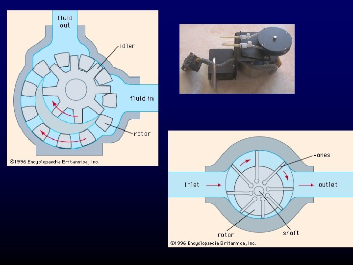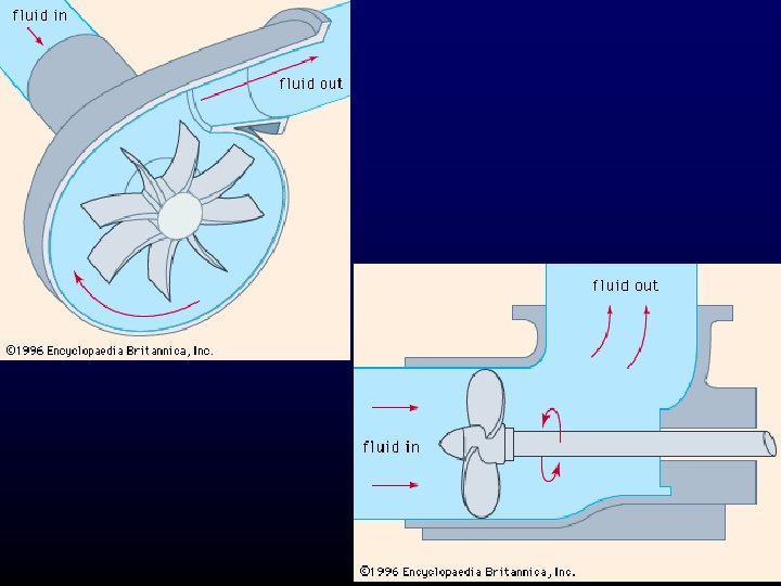 A água é conduzida através do rotor transferindo energia para ele, que é a faz girar transmitindo potência através do eixo para uma máquina externa. -BOMBA HIDRÁULICA: máquina hidráulica que recebe energia de outra máquina (ex: motor). -MÁQUINA HIDRÁULICA MOTRIZ OU TURBINA: máquina hidráulica que fornece energia mecânica para ser transformada.