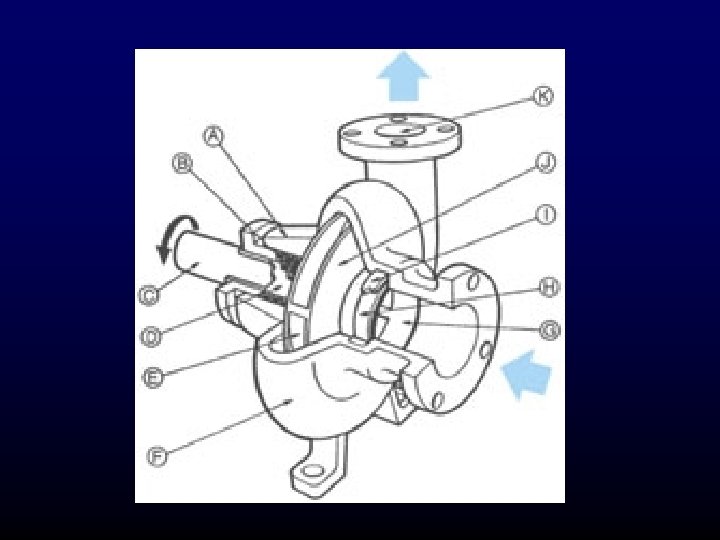 Bombas centrífugas: A energia é fornecida continuamente ao fluido por um rotor, que gira a alta velocidade aumentando a energia cinética que depois é transformada em energia de pressão. Princípio de funcionamento Carcaç Descar O líquido é succionado ga a pela ação de um impulsor Volut que gira rapidamente Sucçã a dentro da carcaça. O o movimento produz uma Pá zona de vácuo (no centro) s Rotor e outra de alta pressão (na periferia).