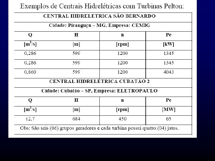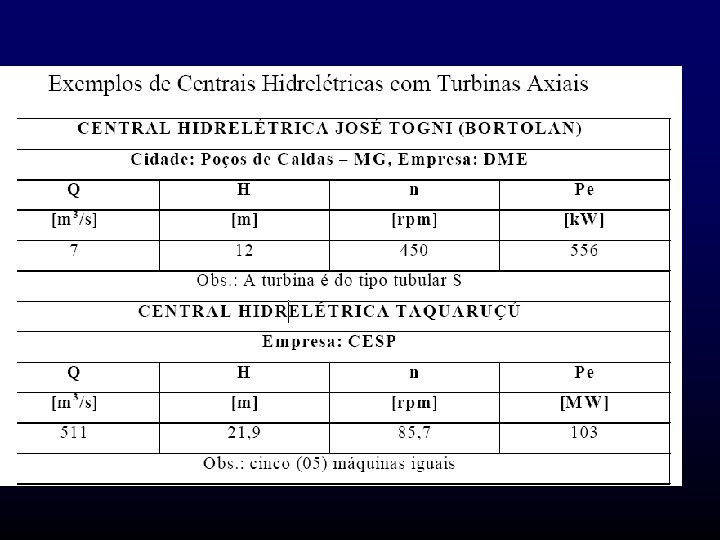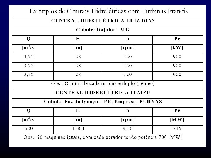 Tipo: Francis Rápida; Local: Rio Paraná - PR - BR; N de Turb. : 18 + 2 de reserva = 20; Potência Unitária Máxima: 740. 000 [k. W]; Altura de Queda Nominal: 118, 40 [m]; Vazão máxima: 710 [m 3/s]; Rotação nominal: 91, 6 [RPM]; Fabricante: MEP - Mecânica Pesada - Taubaté - SP - Brasil