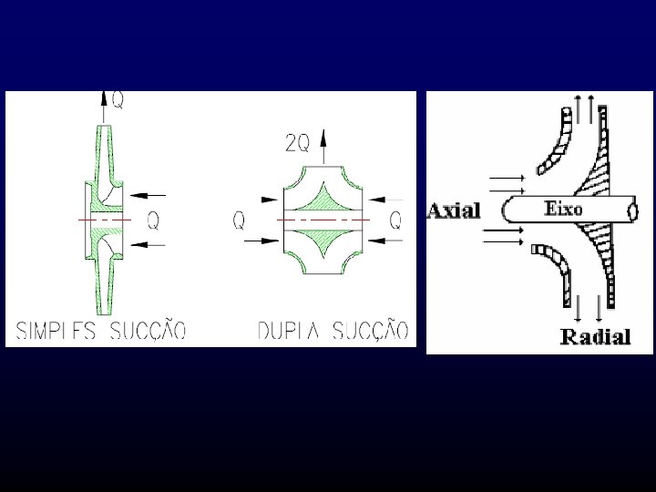 Tipos de escoamento: Axial: Descarrega o fluido axialmente (é adequado para altas vazões, mas desenvolve baixas pressões) Radial: Descarrega o fluido na periferia radialmente (desenvolve altas pressões, adequado para baixas vazões) Misto