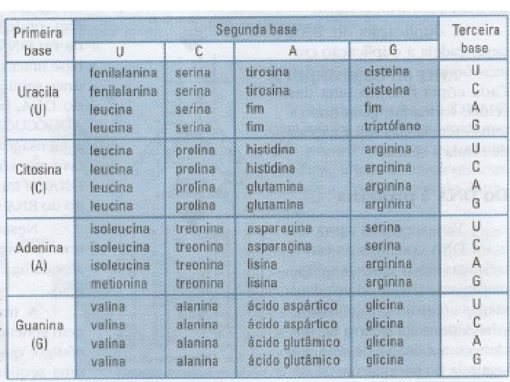O RNA e a Síntese Protéica • Existem 3 tipos de RNA: – RNA mensageiro (RNAm): transporta o código genético do DNA para o citoplasma; – RNA transportador (RNAt): transporta aminoácidos até o local da síntese de proteínas; – RNA ribossômico (RNAr): compõe a estrutura dos ribossomos e participa da síntese de proteínas. • Na tradução, a sequência de bases no RNAm passa para uma sequência de aminoácidos. Cada grupo de 3 bases consecutivas é chamado de CÓDON, e corresponde a um aminoácido. Veja a tabela: