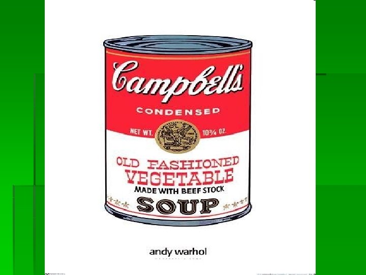 A Pop Art 0 Movimento artístico de origem inglesa, que significa “arte popular”; 0 Desenvolve-se nos Estados Unidos na década de 1960; 0 Eliminação das barreiras entre a arte e a vida comum; 0 Busca por imagens que retratassem o dia-a-dia das grandes cidades norte-americanas; 0 Temas baseados em símbolos e produtos de consumo de massa: lâmpadas elétricas, automóveis, sinais de trânsito, eletrodomésticos, alimentos enlatados e até a imagem de grandes estrelas do cinema norte-americano; 0 EXPOENTES: Andy Warhol (1930 – 1987) e Roy Lichtenstein (1923 – 1997).
