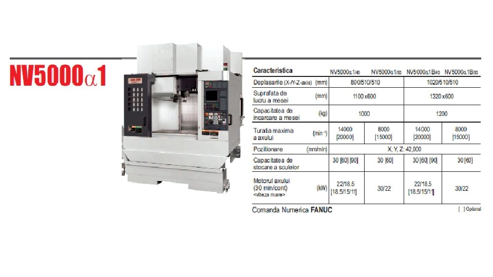NMV 8000 DCG Pentru piese mari, care nu se pot prelucra pe NMV 5000 DCG ATC pentru lungimea maxima a sculei 450 mm ORC™ (Constructie Octogonala) perfecta pentru con Nr. 50 Curse: Axa X: 1, 200 mm Axa Y: 920 mm Axa Z: 610 mm Dimensiunea maxima: Φ 1000× 500 Greutatea maxima: 1, 000 kg Suport suplimentar pentru piesele grele si pentru regimuri intense 0 φ100 Axul Principal: #40: 12, 000 min-1 18, 5/15 kw #40: 20, 000 min-1 22/11 kw #50: 10, 000 min-1 30/25 kw #50: 15, 000 min-1 30/25 kw Sursa MORI SEIKI