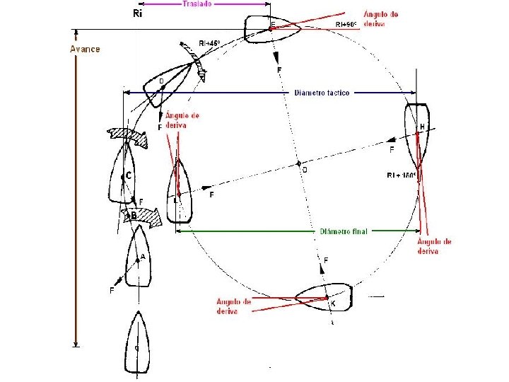 La curva evolutiva se estabiliza, o sea: 1. La velocidad se mantiene constante 2. El ángulo de deriva deja de variar 3. El punto pivote permanece fijo Cuando el buque cambió su curso + o aproximadamente 90º …y allí es donde el momento generado por la resistencia de la carena, de sentido inverso al momento evolutivo, se igualan
