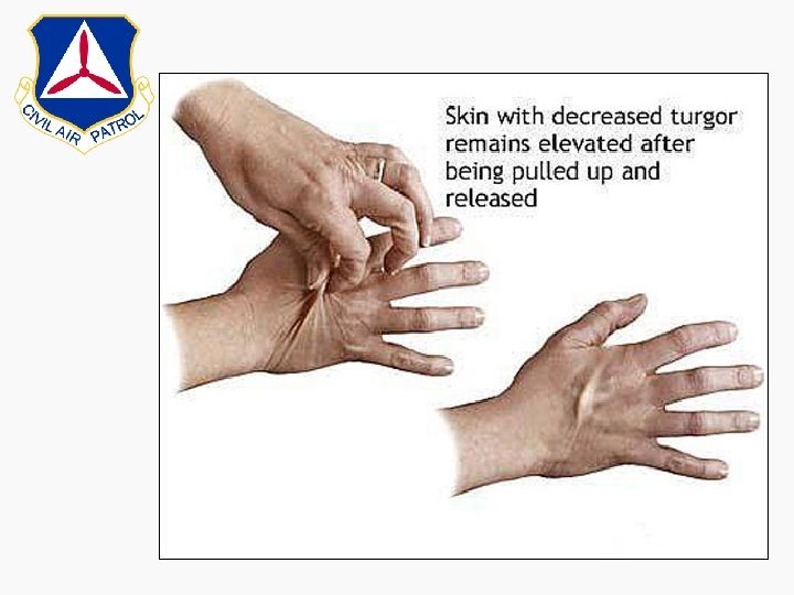 SYMPTOMS & FIRST AID Symptoms: • Dry lips & tongue, nausea, bright or dark colored urine, dizziness, weakness, headaches, and blurred vision. • You can also check skin turgor, which is the skin’s ability to change shape and return to normal (elasticity)…… Skin turgo will be explained in the next slide. First Aid: • Always drink plenty of fluids, especially during and after extended physical activity.