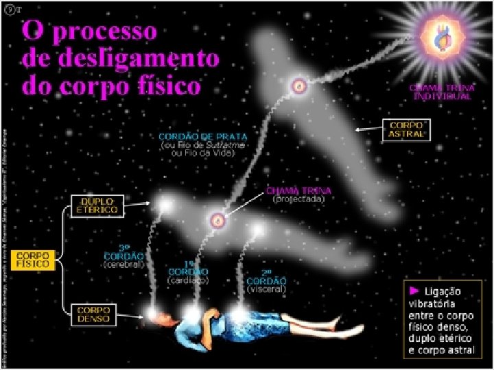 Um cordão prateado liga a alma ao corpo - Dimas entrou em coma, em boas condições. Jerônimo, após ligeiro descanso, voltou a intervir no cérebro. Era a última etapa do processo. Concentrando todo o seu potencial de energia na fossa romboidal, Jerônimo quebrou alguma coisa que André não pôde perceber com minúcias, e brilhante chama violeta-dourada desligou-se da região craniana, absorvendo, instantaneamente, a vasta porção de substância leitosa já exteriorizada. Era difícil fixá-la com rigor. As forças eram dotadas de movimento plasticizante.