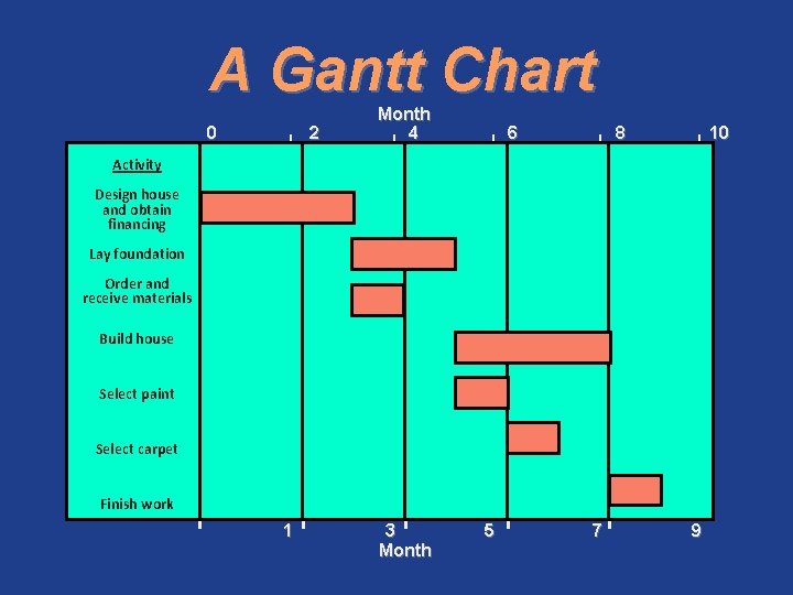 A Gantt Chart 0 | 2 Month | 4 | 6 | 8 | 10 5 7 9 Activity Design house and obtain financing Lay foundation Order and receive materials Build house Select paint Select carpet Finish work 1 3 Month