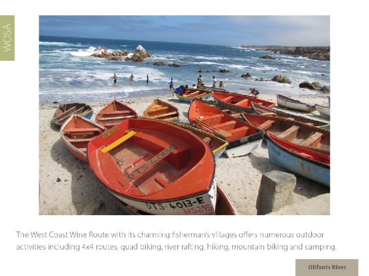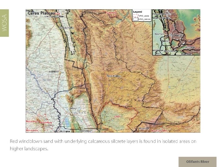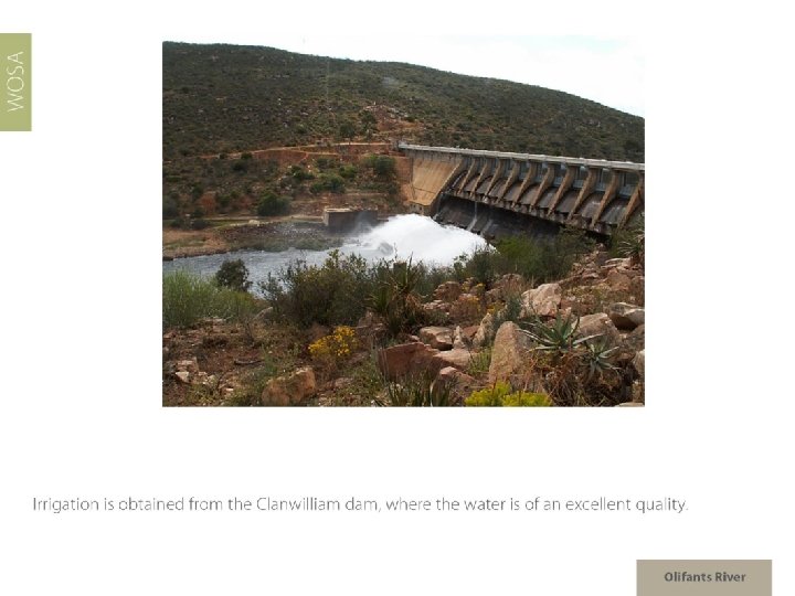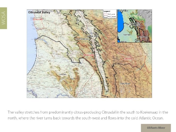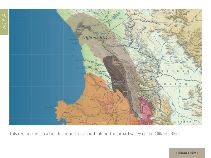 Olifants River Region: Olifants River Districts: Citrusdal Mountain Citrusdal Valley Wards: Piekenierskloof Spruitdrift Vredendal Region: Coastal Districts: Lutzville Valley Ward: Koekenaap Olifants River