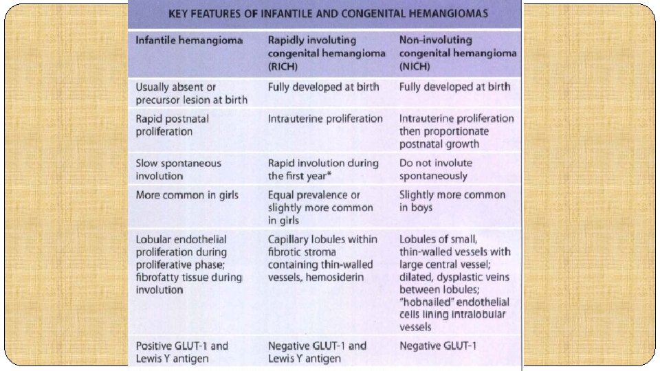NICH lesions; ØThey consist of the classic telangiectatic patch with surrounding slight pallor. Ø unlike infantile HMs, grow proportionately with the child. ØThe lesions may worsen with maturity and do not involute spontaneously. ØThe diagnosis is often established retrospectively after the lesion is excised because involution fails to occur.
