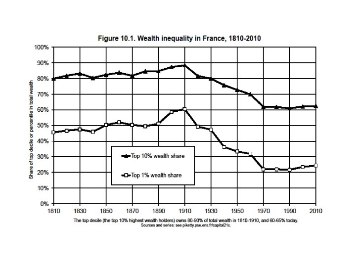 2. The future of wealth concentration • In all European countries (UK, France, Sweden…), wealth concentration was extremely high in 18 c-19 c & until WW 1: about 90% of aggregate wealth for top 10% wealth holders about 60% of aggregate wealth for top 1% wealth-holders = the classic patrimonial (wealth-based) society: a minority lives off its wealth, while the rest of the populaton works (Austen, Balzac) • Today wealth concentration is still very high, but less extreme: about 60 -70% for top 10%; about 20 -30% for top 1% the bottom 50% still owns almost nothing (<5%) but the middle 40% now owns 20 -30% of aggregate wealth = the rise of a patrimonial middle class • How did it happen, and will it last? Will the patrimonial middle class expend, or will it shrink?