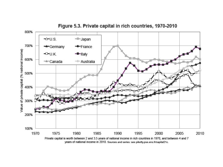 Figure S 5. 2. Private capital in rich countries: from the Japanese to the Spanish bubble 800% U. S. A Japan Germany France U. K. Italy Canada Australia Spain Value of private capital (% of national income) 700% 600% 500% 400% 300% 200% 1970 1975 1980 1985 1990 1995 2000 2005 Private capital almost reached 8 years of national income in Spain at the end of the 2000 s (ie. one more year than Japan in 1990). Sources and series: see piketty. pse. ens. fr/capital 21 c. 2010