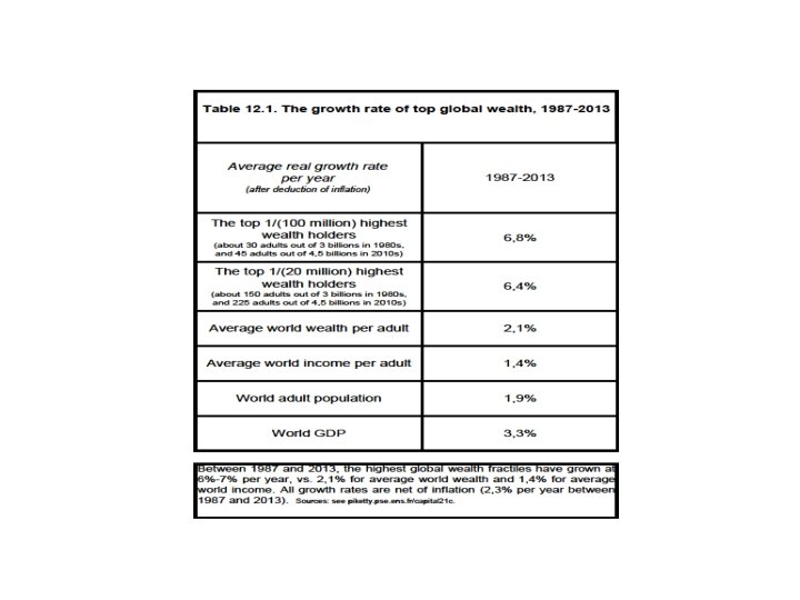 Conclusions • The history of income and wealth inequality is always political, chaotic and unpredictable; it involves national identities and sharp reversals; nobody can predict the reversals of the future • Marx: with g=0, β↑∞, r→ 0 : revolution, war • My conclusions are less apocalyptic: with g>0, at least we have a steady-state β=s/g • But with g>0 & small, this steady-state can be rather gloomy: it can involve a very large capital-income ratio β and capital share α, as well as extreme wealth concentration due to high r-g • This has nothing to do with a market imperfection: the more perfect the capital market, the higher r-g • The ideal solution: progressive wealth tax at the global scale, based upon automatic exchange of bank information • Other solutions involve authoritarian political & capital controls (China, Russia. . ), or perpetual population growth (US), or inflation, or some mixture of all