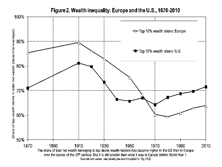 • The US distribution of income has become more unequal than in Europe over the course of the 20 th century; it is now as unequal as pre-WW 1 Europe • But the structure of inequality is different: US 2013 has less wealth inequality than Europe 1913, but higher inequality of labor income