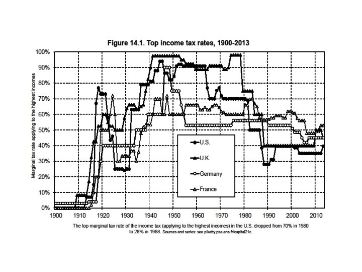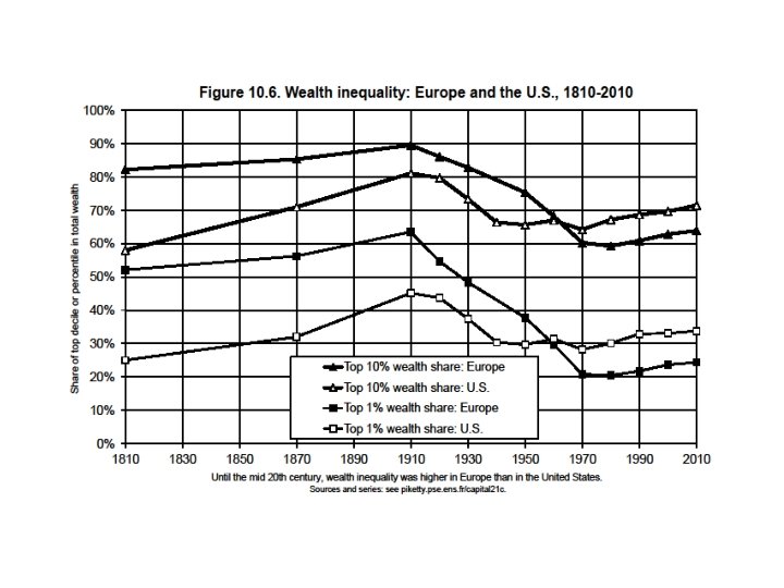 • The US distribution of income has become more unequal than in Europe over the course of the 20 th century; it is now as unequal as pre-WW 1 Europe • But the structure of inequality is different: US 2013 has less wealth inequality than Europe 1913, but higher inequality of labor income