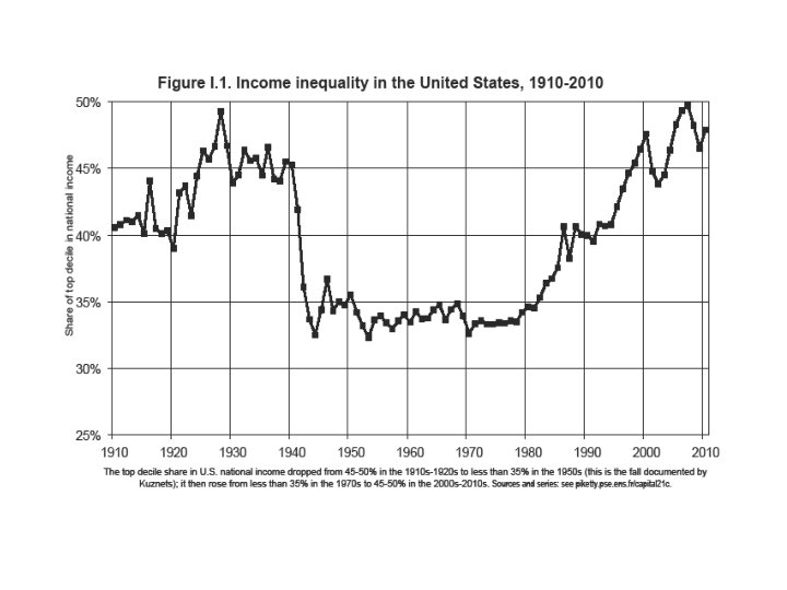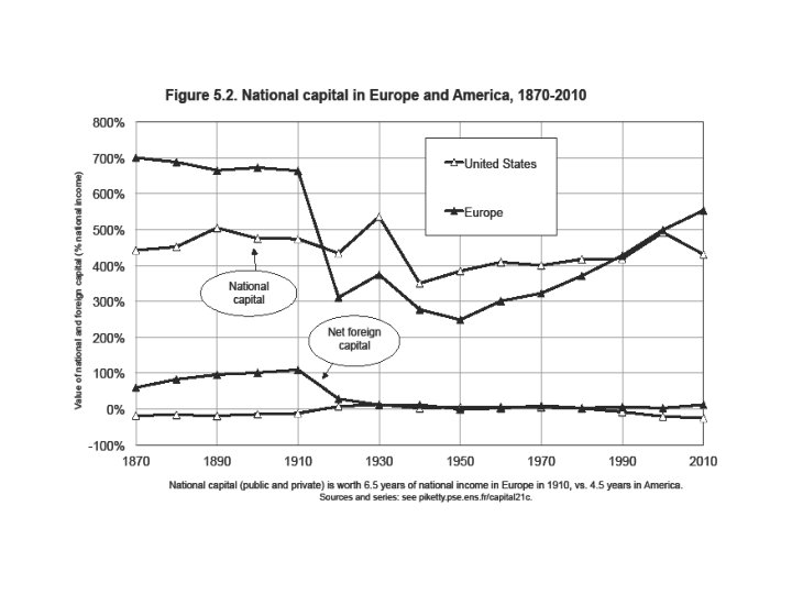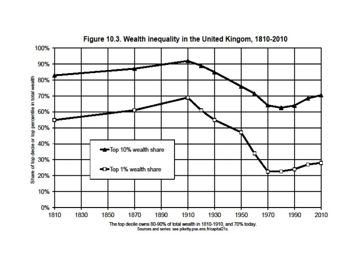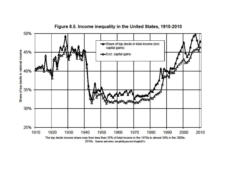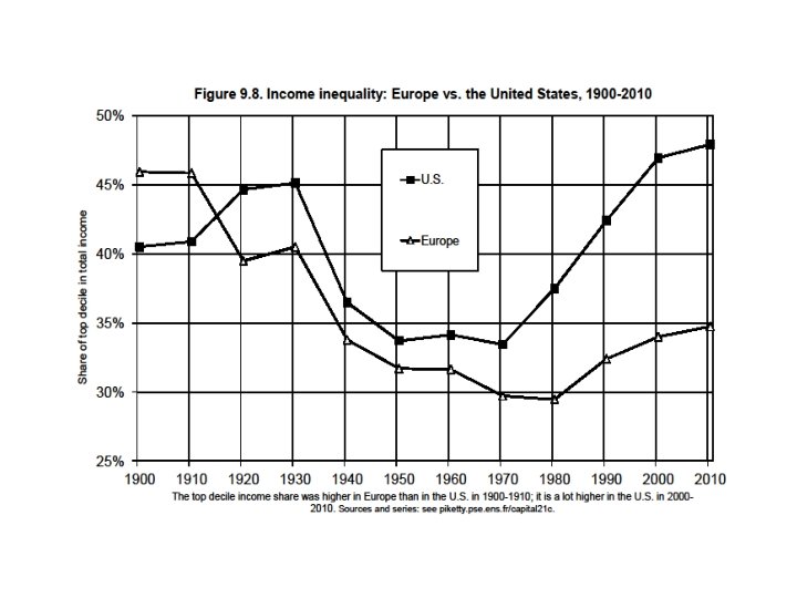 • The US distribution of income has become more unequal than in Europe over the course of the 20 th century; it is now as unequal as pre-WW 1 Europe • But the structure of inequality is different: US 2013 has less wealth inequality than Europe 1913, but higher inequality of labor income