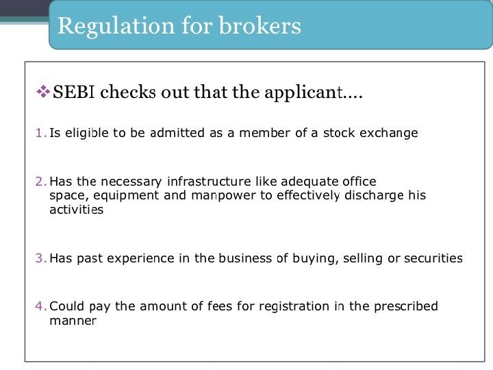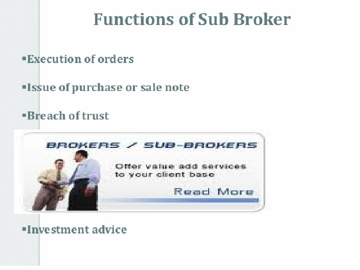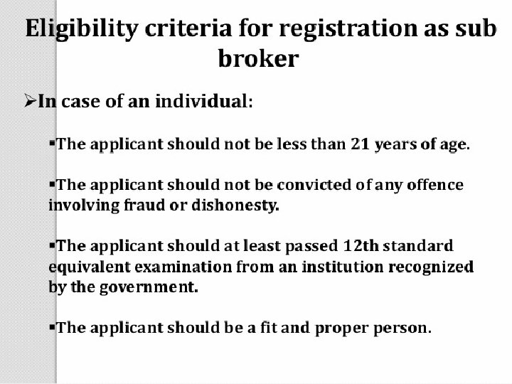 SUB BROKERS • An intermediary broker, from whom another broker acquires the reinsurance that needs to be placed. • Person who is not a Trading Member of a Stock Exchange but who acts on behalf of a Trading Member as an agent or otherwise for assisting investors in dealing in securities through such Trading Members. • All Sub-Brokers are required to obtain a Certificate of Registration from SEBI without which they are not permitted to deal in securities. a Sub-Broker unless they are registered with SEBI can wok as a Sub-Broker.
