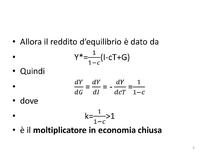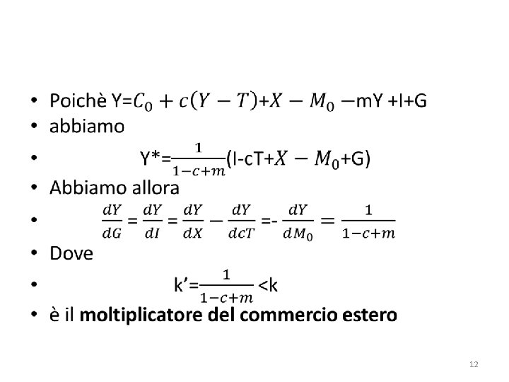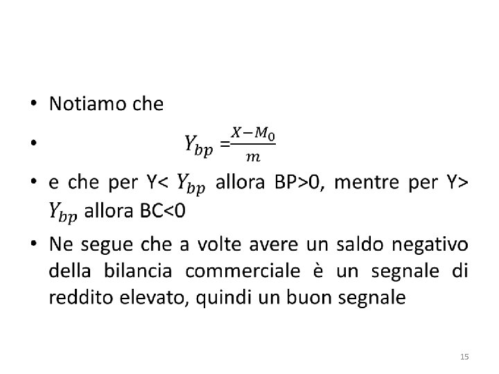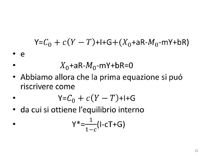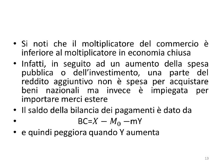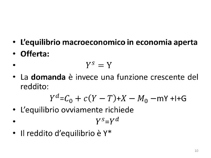 • La funzione delle esportazioni • In un’economia piccola le esportazioni dipendono dal reddito dei partner commerciali e possono vinire considerate come esogene: • X= X 9