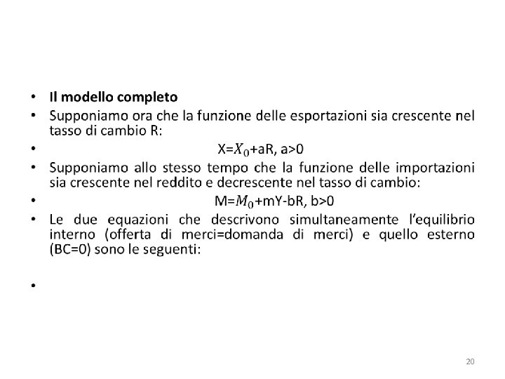 • Approccio elasticità dell’aggiustamento • Se l’economia considerata è al di sotto del livello del pieno impiego e conosce un disavanzo della bilancia commerciale, allora la sua valuta si deprezza. Questo stimola le esportazioni e riduce le importazioni e quindi migliora il saldo della bilancia dei pagamenti. Ovviamente pure il reddito aumenta, il che conduce ad un aumento delle importazioni ma minore dell’iniziale riduzione 18