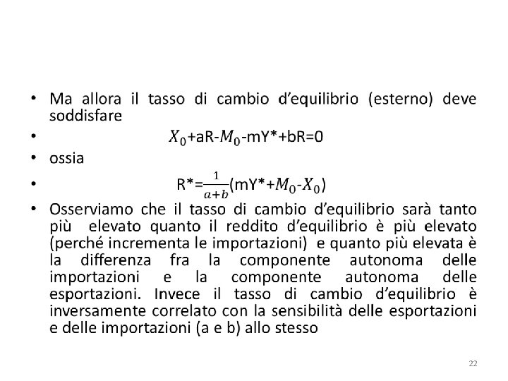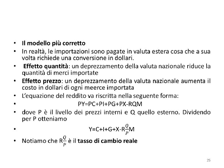 • Sintesi degli aggiustamenti automatici • In regime di tassi di cambio flessibili, un deprezzamento della valuta nazionale aumenta il reddito che a sua volta aumenta le importazioni. Allora il deprezzamento deve essere superiore rispetto al caso in cui non ci fossero degli aggiustamenti del reddito 34